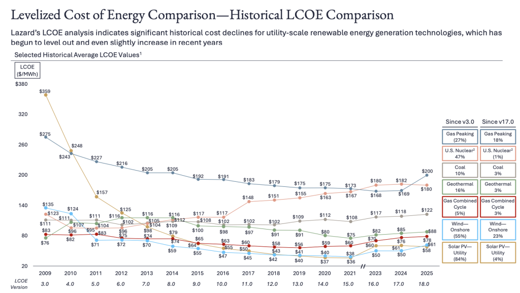 L’électricité verte est de plus en plus rentable comme le montre le LCOE 2025 de la banque Lazard. La baisse des prix du MWh s’expliquent par progrès technologiques rapides des énergies renouvelables, en particulier le solaire photovoltaïque et l’éolien terrestre.