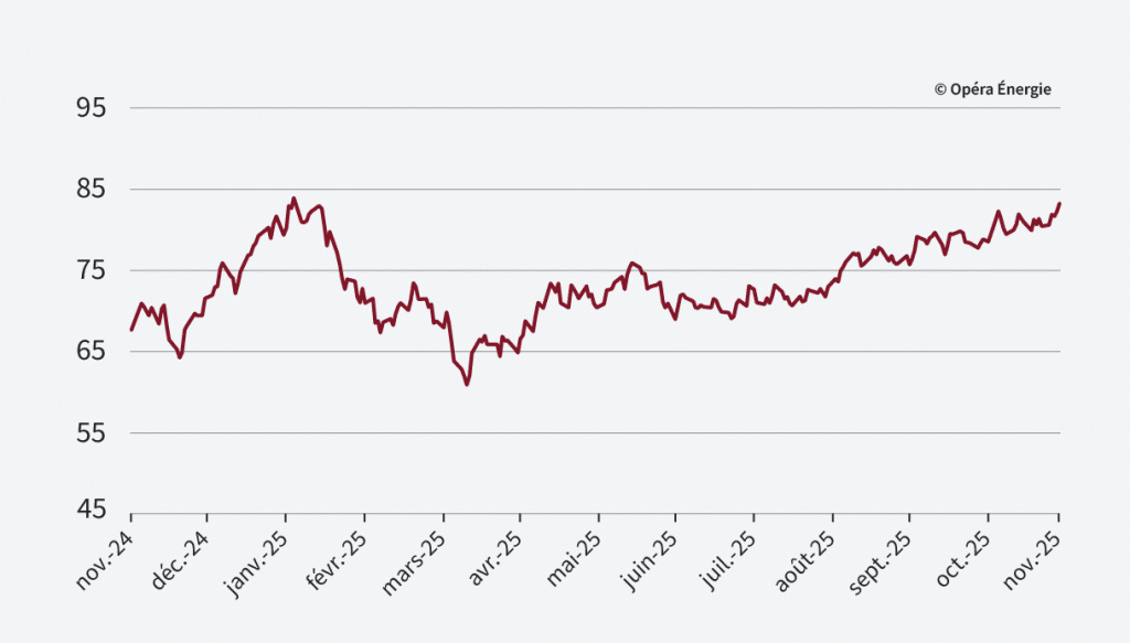 Le Brent a touché un plus bas vendredi, poursuivant une série de quatre mois de repli sous l’effet des inquiétudes liées à un excédent d’offre, entre reprise de capacités au sein de l’OPEP+ et hausse de la production hors cartel. Les signaux autour d’un possible plan de paix en Ukraine pèsent également. Lundi, les prix marquent à la hausse, après la décision de l’OPEP+ de suspendre les hausses de production début 2026. Ce soutien reste toutefois limité par les perspectives d’une offre mondiale plus abondante.