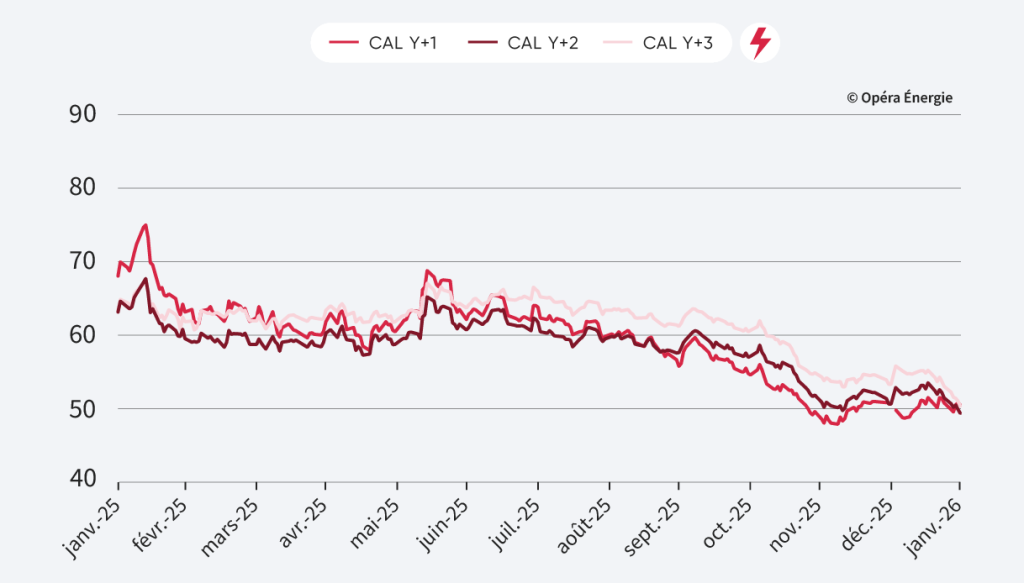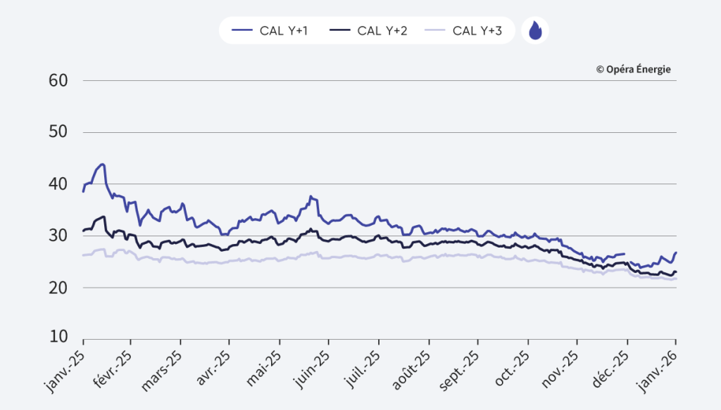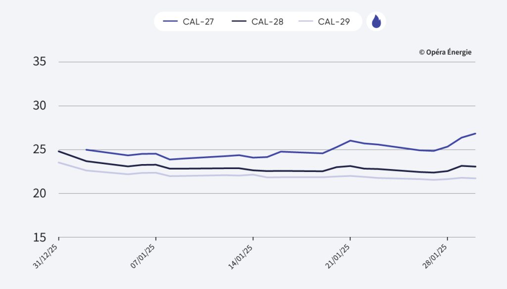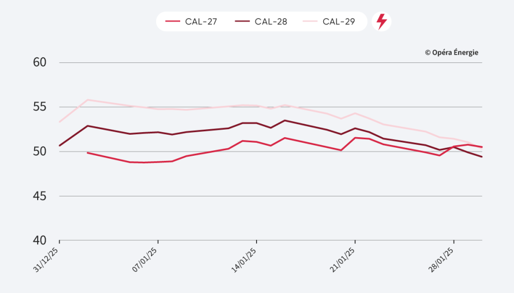 l’ASNR a souligné la nécessité d’une politique énergétique plus lisible et stable, alors que le vieillissement du parc nucléaire relance les débats sur la prolongation de la durée de vie de certains réacteurs au-delà de 60 ans. Notons encore que le Cal-28 a clôturé en dessous du prix Cal-27 vendredi. Le prix se resserre sur toutes les échéances et le marché pourrait repasser en backwardation après plusieurs mois en contango.