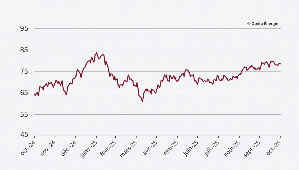 Le prix des quotas carbone a évolué dans une fourchette étroite de 77 à 79 €/t, soutenu par des achats opportunistes lors des phases de repli.