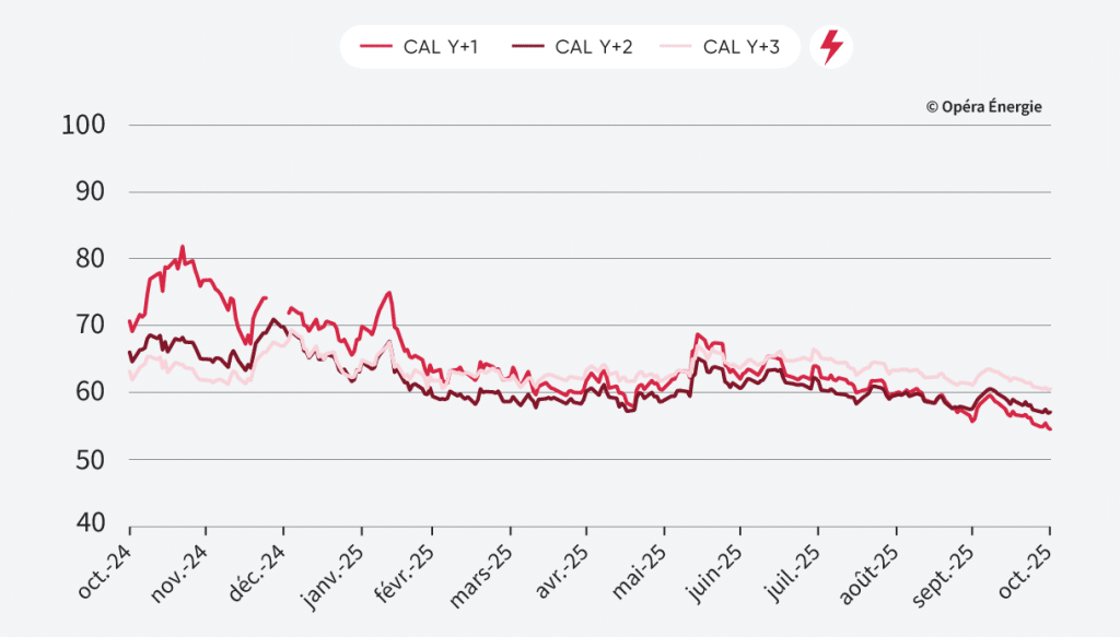 Évolution des prix de l’électricité depuis 1 an (en €/MWh)