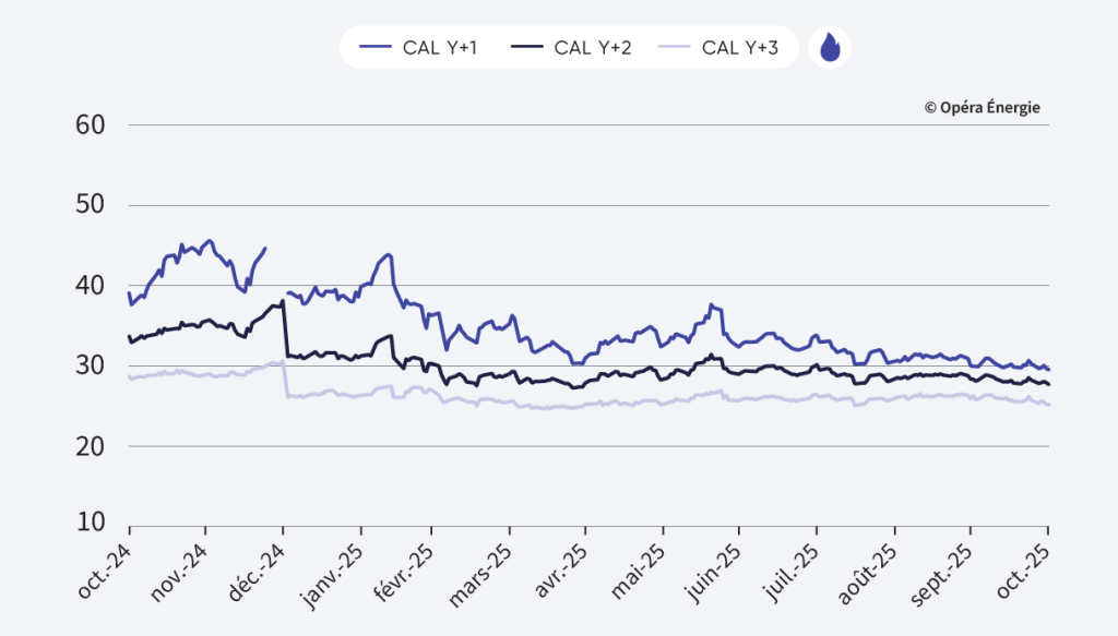 Les prix à terme du gaz français se maintiennent sous les 30 €/MWh, testant des niveaux planchers sur 18 mois dans un contexte de demande modérée, d’afflux massif de GNL et d’un retour, en fin de semaine dernières, des flux attendus de gaz norvégien.