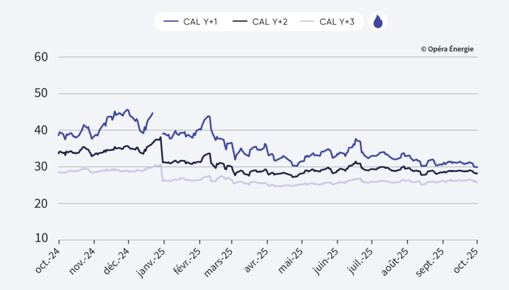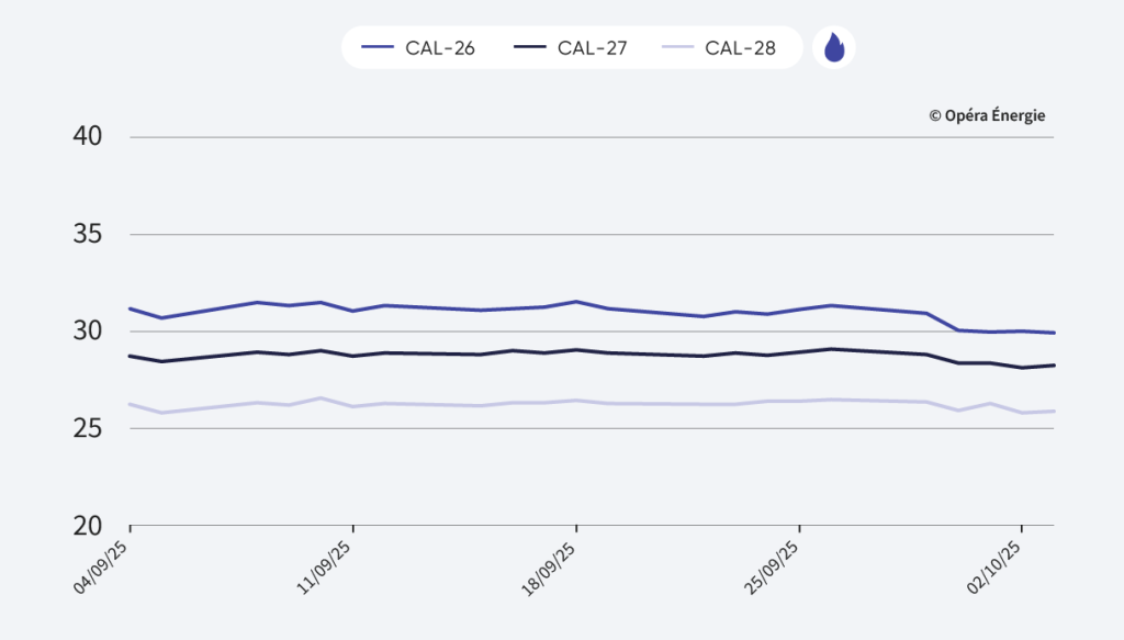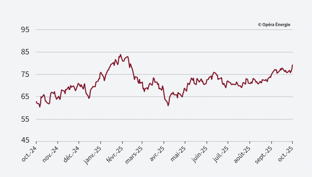 Les prix du gaz reculent, à la faveur de stocks européens bien remplis (82,5 %, avec plus de 90 % en France). La demande de GNL reste modérée en Asie, libérant des volumes pour l’Europe, tandis que les exportations américaines ont atteint un niveau record en septembre. Les flux norvégiens ont également repris, après les pannes sur les champs gaziers de Njord et Troll. À plus long terme, la hausse attendue de 60 % des capacités mondiales de GNL d’ici 2030 soulève le risque d’un surapprovisionnement.