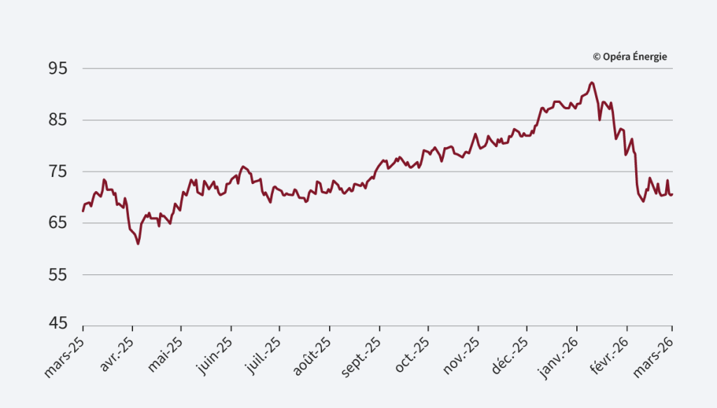 Le prix du CO₂ se maintient, malgré la forte volatilité observée sur les marchés de l’énergie. Le marché surveille de près les discussions au sein de la Commission européenne sur une possible augmentation des allocations gratuites dans le cadre de l’ETS. Par ailleurs, l’instabilité géopolitique pourrait peser sur les perspectives de croissance économique : un ralentissement de l’activité industrielle se traduirait mécaniquement par une baisse des émissions et donc de la demande de quotas carbone.