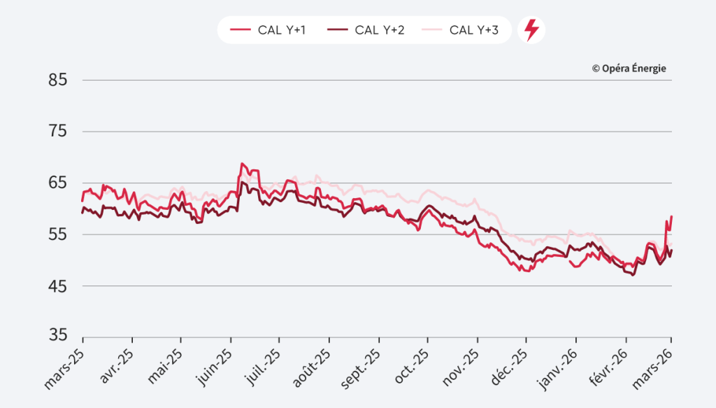 Les prix calendaires reflètent des anticipations de tensions à long terme sur le marché du gaz, tandis que la bonne disponibilité du parc nucléaire et un prix du carbone stable limitent la hausse.