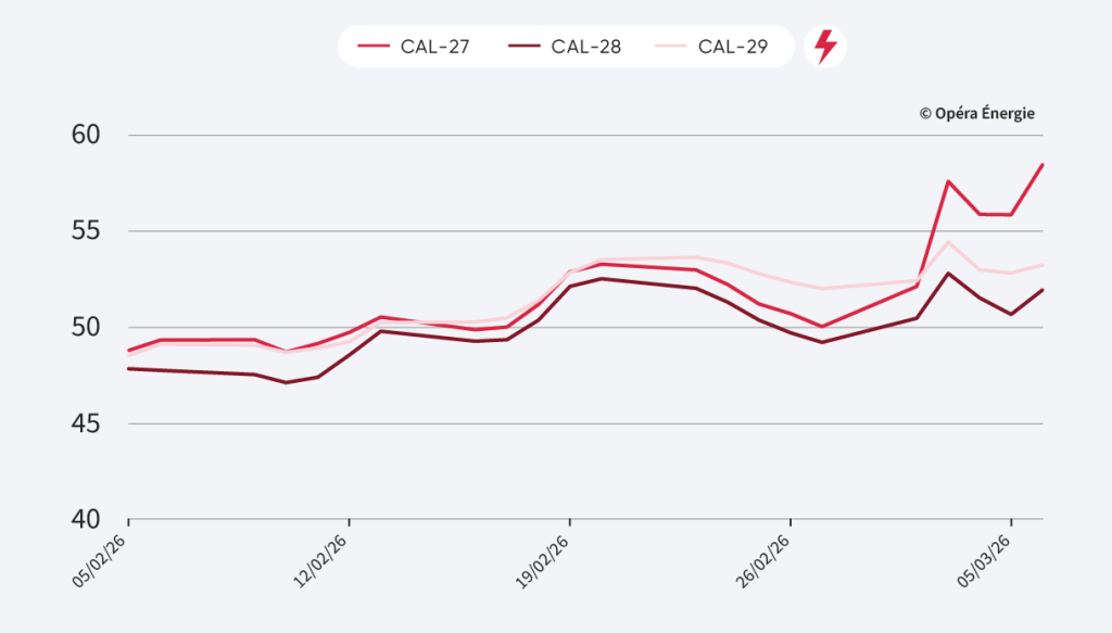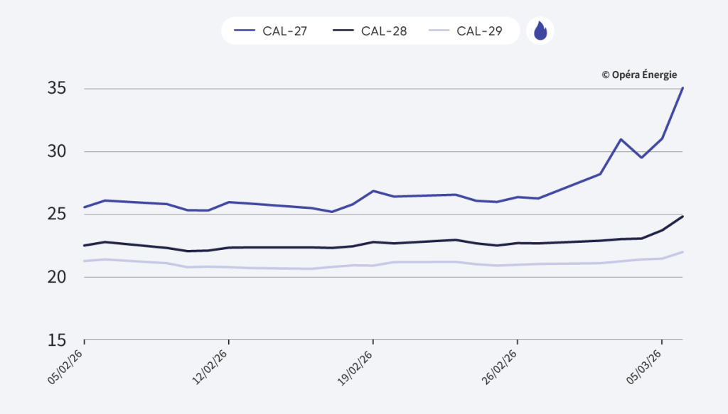 Les prix du gaz européen poursuivent leur hausse, soutenus par les tensions au Moyen-Orient et les perturbations dans le détroit d’Ormuz. Cette progression intervient alors que les stocks européens restent particulièrement faibles (sous les 30 %), avec des réserves attendues entre 22 % et 27 % en fin d’hiver, bien en dessous de la moyenne historique. Le Cal-27 a ainsi bondi de 33 % sur la semaine, tandis que les échéances plus lointaines restent plus stables, reflétant l’incertitude sur la durée du conflit et son impact réel sur les flux mondiaux de GNL.