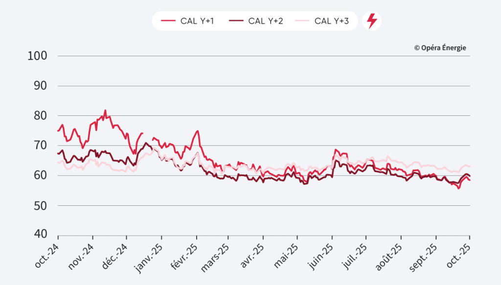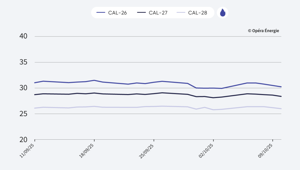 Sur le marché à terme, la dynamique haussière du gaz et du CO₂ soutient les prix. La disponibilité du nucléaire est cependant toujours très haute, autour de 51 GW