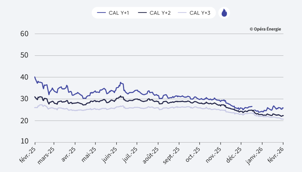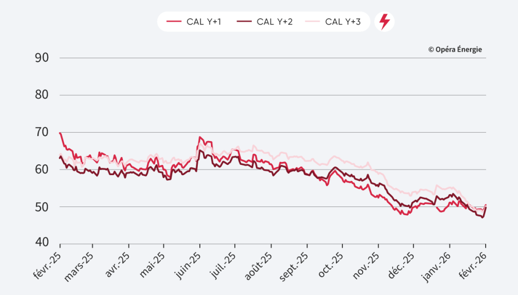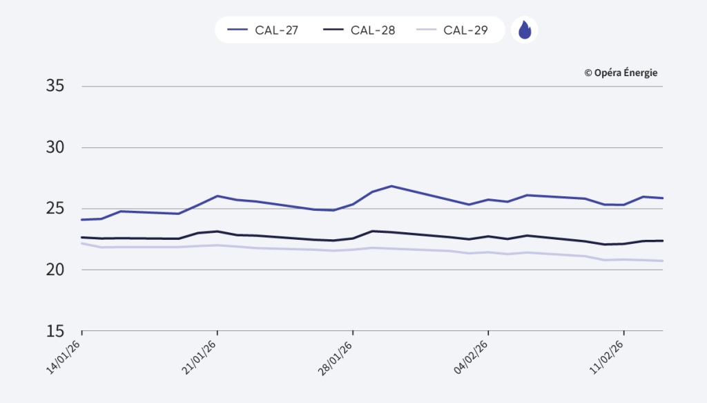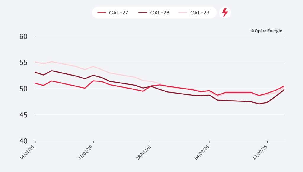 Les échéances long terme affichent une correction haussière sur la semaine. Malgré ce rebond technique, les prix restent contenus et évoluent toujours autour du seuil symbolique des 50 €/MWh, niveau qui continue de faire office de plafond à court terme.