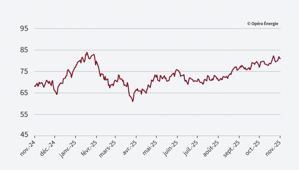 Le marché du CO₂ reste volatil : après un net recul fin de semaine dernière, le prix des quotas a rebondi au-dessus des 80 €/t. Ce rebond s’explique par des prévisions de températures plus froides, susceptibles d’augmenter la demande en énergie, ainsi que par un sentiment haussier persistant chez les investisseurs.