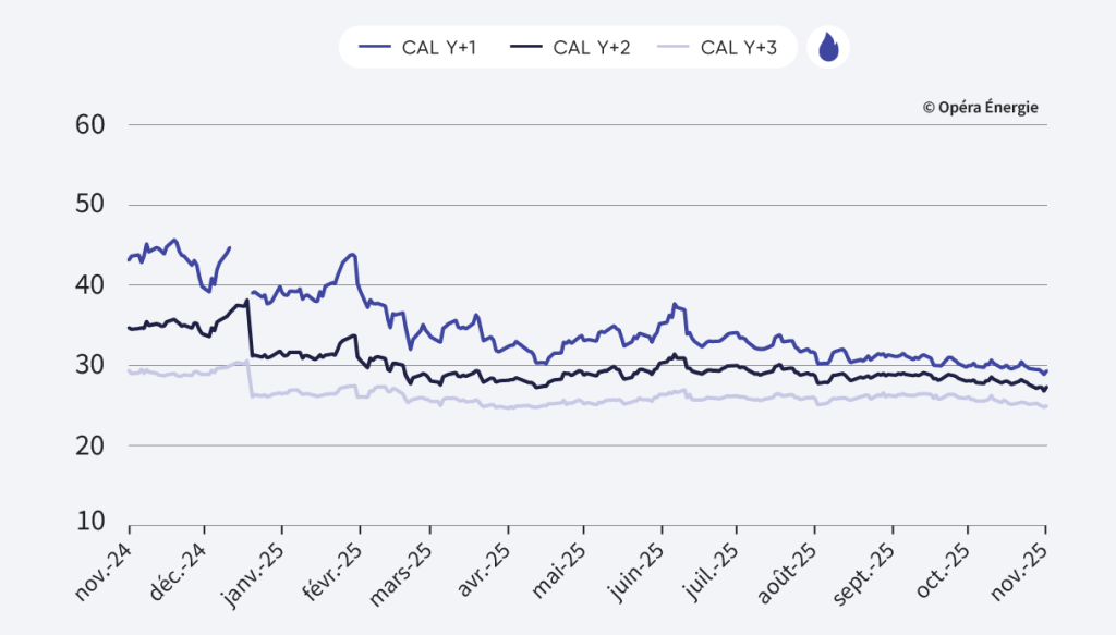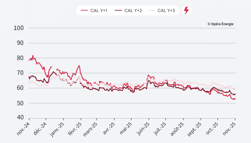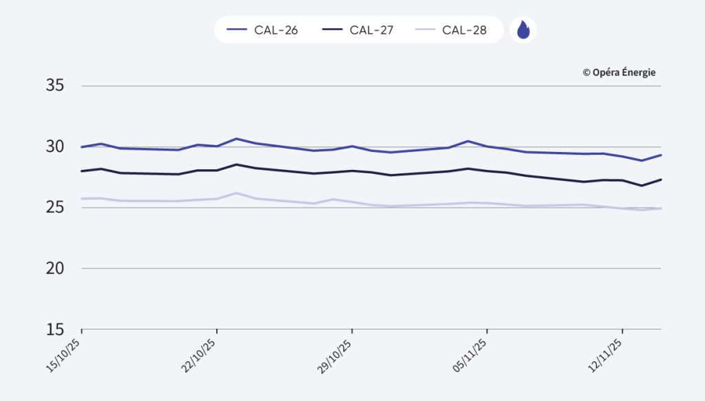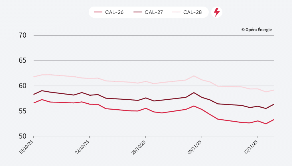Sur les marchés à terme, les prix se maintiennent, dans le sillage des prix du gaz et dans un contexte de production, EnR comme nucléaire, favorable. La baisse des températures annoncée pour cette semaine devrait néanmoins apporter plus de tensions et de volatilité. En France, l’actualité reste dense : Anne Le Henanff, ministre déléguée chargée de l’Intelligence artificielle et du Numérique, a annoncé au Sénat, le 12 novembre, que « la définition des seuils du mécanisme VNU est en cours de finalisation » ; EDF engage une montée en puissance du nucléaire (augmentation de capacité sur 13 réacteurs de 900 MW et avancées sur les EPR2) ; enfin, l’Électricien historique a indiqué ouvrir ses CAPN dès 2027 à un plus grand nombre d’acteurs.