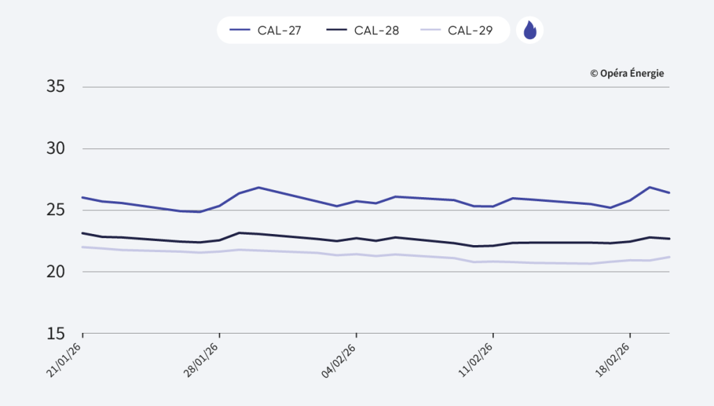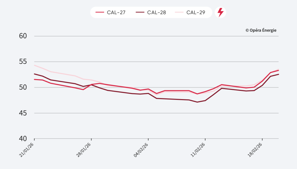 Sur le marché forward, l’évolution des prix est corrélée à celle des prix du gaz et du carbone. Le produit Cal-27 a notamment atteint son plus haut niveau depuis le 01/01/2026 à 53,3 €/MWh. En France, le groupe EDF a annoncé vendredi un recul de 26,3 % de son bénéfice net en 2025, pénalisé par la baisse des prix de l’électricité sur les marchés, malgré une production nucléaire en hausse qui a partiellement amorti l’impact.