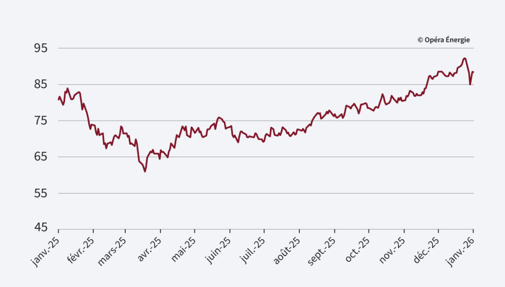 Les prix des quotas de CO₂ ont connu une forte volatilité en amont du Forum de Davos, entre perspectives météorologiques et tensions géopolitiques. Le marché a fortement corrigé à la baisse, avant de se redresser à la suite des déclarations du président américain annonçant la suspension de droits de douane additionnels, dans le cadre d’un accord de principe sur le Groenland. Cependant, l’instabilité persistante du contexte macroéconomique pourrait peser sur l’activité industrielle et, à terme, limiter la demande en quotas.