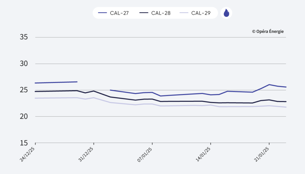 Malgré la hausse des prix du gaz cette semaine les prix de l’électricité ont baissé pour se stabiliser autour des 50€/MWh pour CAL27. Le redémarrage de Flamanville est programmé au 1er février. La production éolienne est repartie à la hausse cette semaine ce qui a contribué à apaiser les prix courts termes. _La CRE propose de maintenir les tarifs du TRV stables en moyenne malgré la baisse des prix de marché ces derniers mois à cause de la fin de l’ARENH et de la hausse du coûts des CEE.