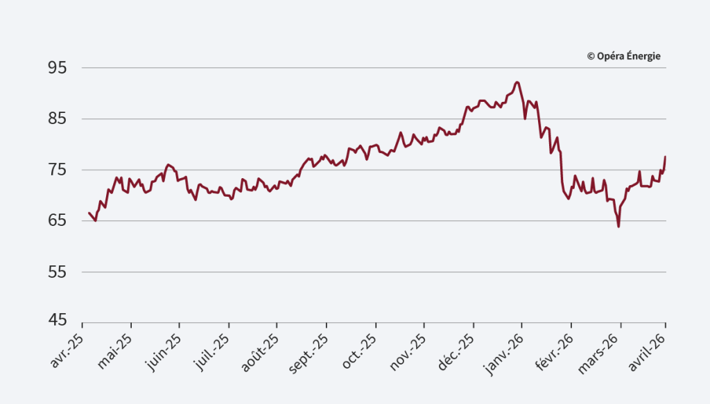Les prix baissent sur la semaine, à la faveur de l’annonce du maintien de l’ouverture du détroit d’Hormuz. Dans le même temps, la concurrence asiatique reste limitée et la demande européenne modérée, sous l’effet d’un climat clément et d’une bonne production renouvelable. Les fondamentaux restent toutefois contrastés : les stocks progressent lentement (29,5 % en moyenne) tandis que les flux de GNL américain sont soutenus. En début de semaine, les prix repartent à la hausse avec le retour du risque géopolitique après de nouveaux revirements sur Hormuz.