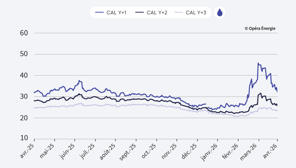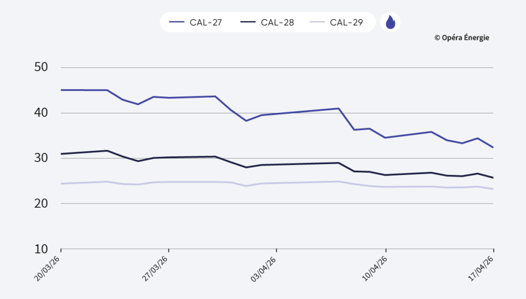 Les prix se replient, dans le sillage de l’accalmie observée sur les marchés du gaz et du pétrole. Le baseload CAL27 français s’inscrit ainsi dans une correction baissière, revenant sur des niveaux proches de l’avant-crise. Sur le plan structurel, les tensions récentes au Moyen-Orient ont relancé le débat sur l’électrification, avec des ambitions renforcées en France : jusqu’à 10 Md€ d’investissements annuels d’ici 2030 et une réduction attendue de 85 TWh des importations de gaz. Cette dynamique vise à stimuler la demande électrique dans un contexte de souveraineté énergétique accrue. Enfin, EDF confirme une production nucléaire attendue entre 315 et 345 TWh cette année, confortant les perspectives d’offre.